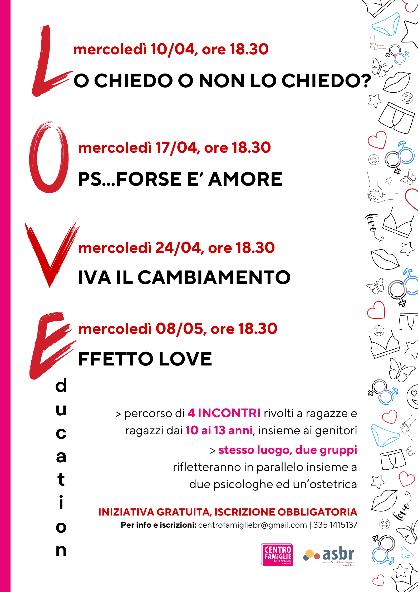 LOVEeducation Percorso di 4 incontri rivolti a ragazze e ragazzi dai 10 ai 13 anni insieme ai genitori sui temi di affettività e sessualità Presso il Centro per le Famiglie Bassa Reggiana, via Bellini 7, Guastalla (RE) LO CHIEDO O NON LO CHIEDO? OPS.. FORSE È AMORE VIVA IL CAMBIAMENTO EFFETTO LOVE 10 APRILE…