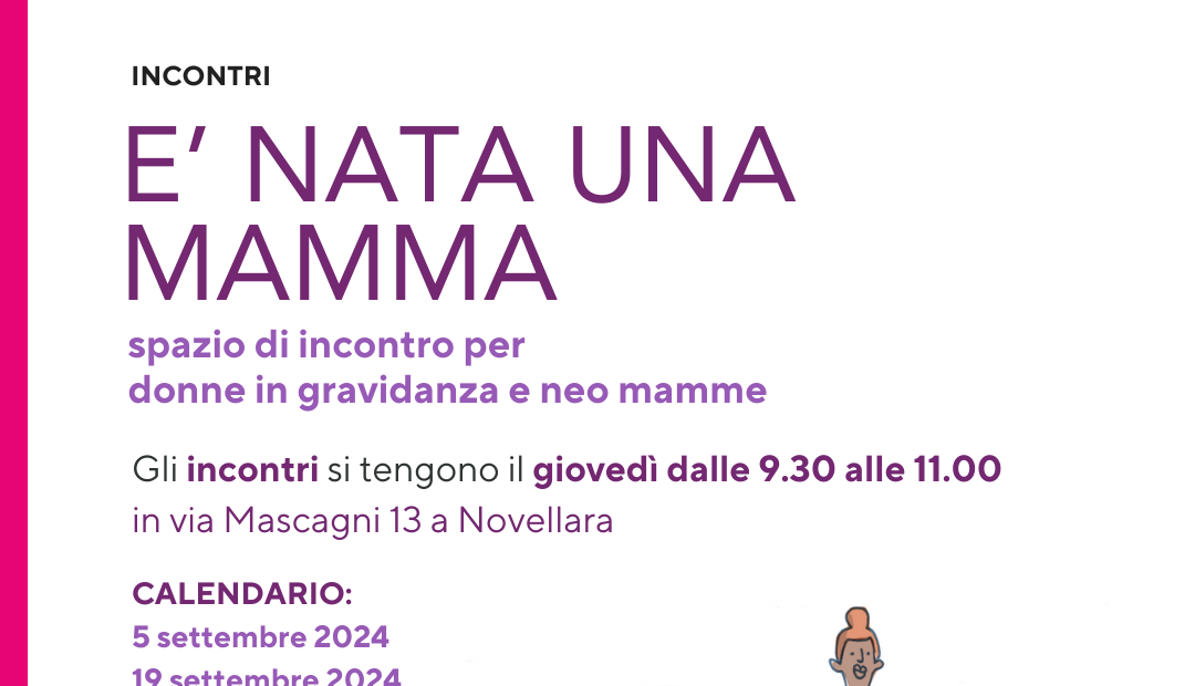 E’ NATA UNA MAMMA E’ NATA UNA MAMMA. Uno spazio di incontro dove potersi raccontare, confrontarsi e ascoltare in un clima sereno e accogliente; gli incontri sono aperti a mamme insieme ai loro bambin* ma anche per mamme in attesa. Condurranno gli incontri una psicologa del Centro per le Famiglie e l’ostetrica dell’Azienda Ausl dott.ssa…