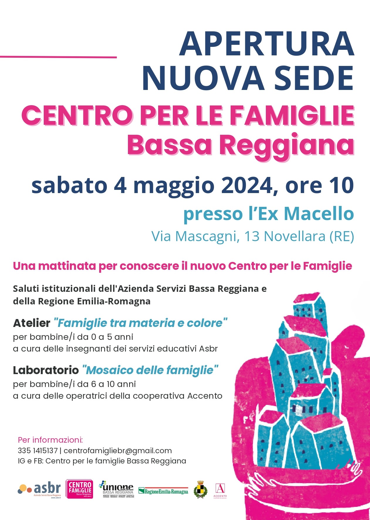 Apertura della NUOVA SEDE del Centro per le Famiglie Bassa Reggiana SABATO 4 MAGGIO ALLE ORE 10 A NOVELLARA, VIA MASCAGNI 13 (ex Macello) Dopo i saluti istituzionali dell’Azienda Servizi Bassa Reggiana e della Regione Emilia-Romagna, saranno organizzati: Atelier “Famiglie tra materia e colore” per bambine/i da 0 a 5 anni a cura delle insegnanti dei servizi educativi ASBR…