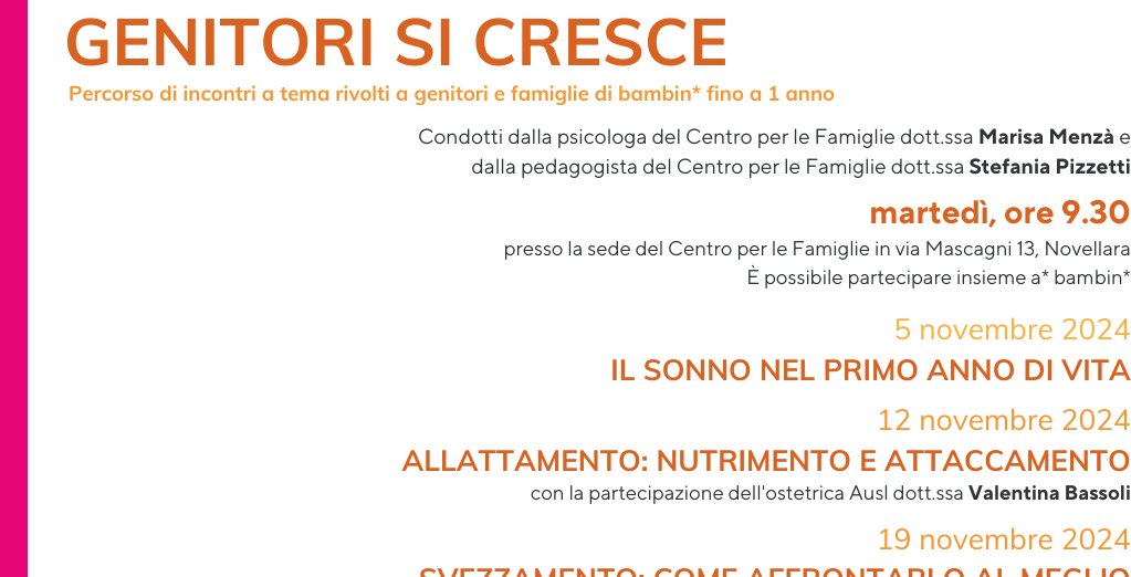 GENITORI SI CRESCE Percorso di incontri a tema rivolti a genitori e famiglie di bambin* fino a 1 anno Condotti dalla psicologa del Centro per le Famiglie Dott.ssa Marisa Menzà e dalla pedagogista del Centro per le Famiglie Dott.ssa Stefania Pizzetti. Gli incontri si terranno il martedì alle ore 9.30 presso la sede del Centro per le…