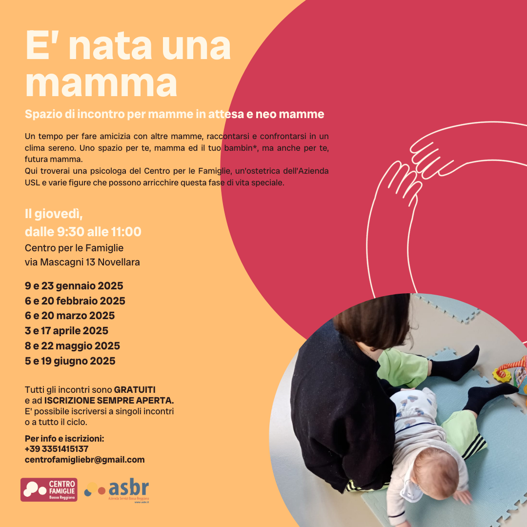 E’ NATA UNA MAMMA 2025 Spazio di incontro per mamme in attesa e neo mamme Un tempo per fare amicizia con altre mamme, raccontarsi e confrontarsi in un clima sereno. Uno spazio per te, mamma ed il tuo bambin*, ma anche per te, futura mamma. Qui troverai una psicologa del Centro per le Famiglie, un’ostetrica…